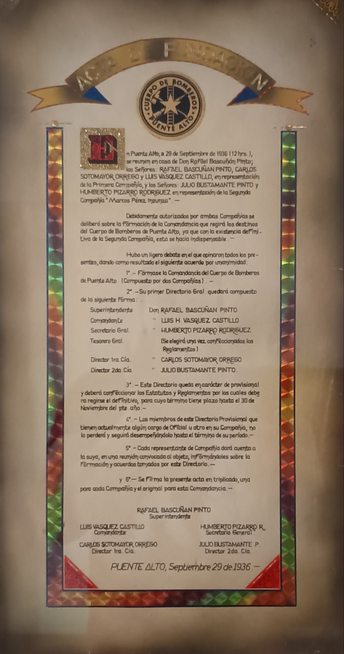 En Puente Alto, el 29 de septiembre de 1936 (12:00 horas), se reunieron en la casa de don Rafael Bascuñán Pinto los señores: Rafael Bascuñán Pinto, Carlos Sotomayor Orrego y Luis Vásquez Castillo, en representación de la Primera Compañía de Bomberos; y el señor Julio Bustamante, en representación de la Segunda Compañía de Bomberos “Marcos Pérez Insunza”. Debidamente autorizados por ambas Compañías se deliberó la formación de la Comandancia que regirá los destinos del Cuerpo de Bomberos Puente Alto.